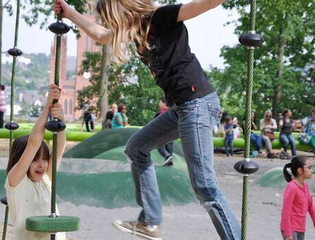 Der Spielplatz am Schulberg in Wiesbaden ist etwas für Klettermaxen. Insgesamt 100 Meter ist das grüne Klettergerüst lang, das sich auf dem ganzen Spielplatz schlängelt. Zusätzlich gibt es noch einige Spielstationen auf dem Klettergerüst, bei denen man seine Geschicklichkeit unter Beweis stellen kann. Daneben gibt es Rutschen, Trampoline und Kletterlianen.