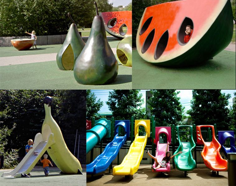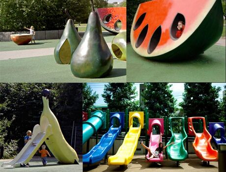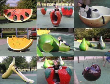 Schon einmal aus einer Banane gerutscht, auf einer Kirsche geschaukelt oder in einen Apfel geturnt? Das alles und vieles mehr bietet der Obst- und Gemüsespielplatz in Stockholm. Daneben gibt es noch Wassermelonenwippen und einen großen Kletterbaum.