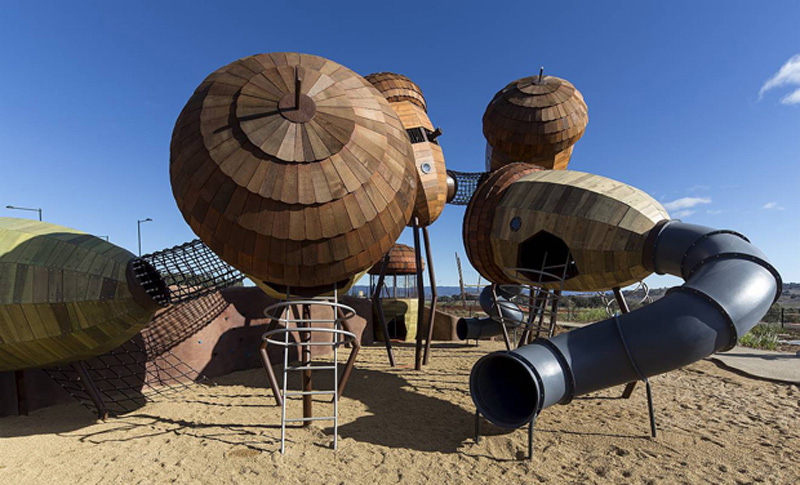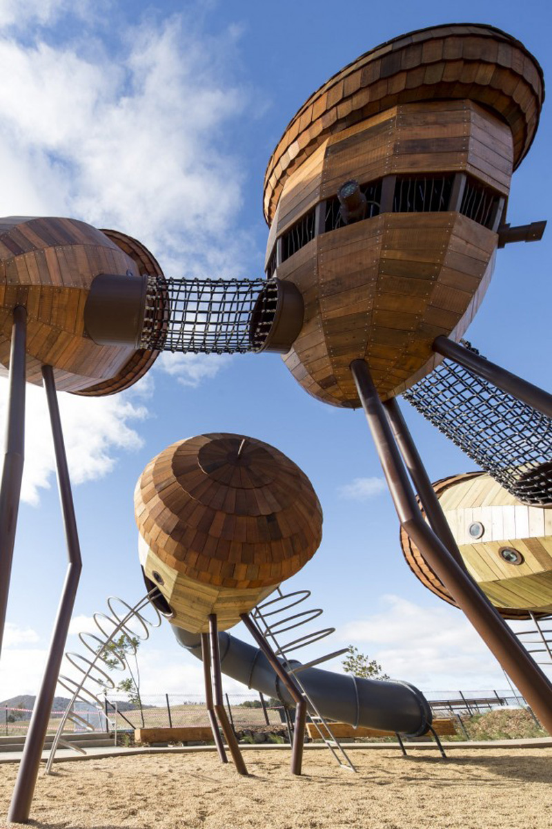 Der Pod Spielplatz liegt in einem Arboretum in der Nähe von Canberra, das 100 Wälder mit seltenen und gefährdeten Baumarten aus aller Welt beherbergt. Die Architekten des Spielplatzes haben das Thema des Waldes auch im Spielplatz umgesetzt. So sind etwa einzelne Elemente optisch Baumfrüchten wie Eicheln nachempfunden. Die verschiedenen Früchte sind durch Rutschen und Kletternetze miteinander verbunden. Daneben gibt es Spielhäuser, Insektenhöhlen, Windspiele und Kletterwände.