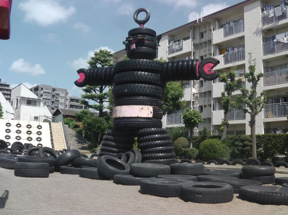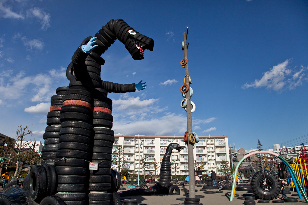 Auf der Such nach besonderen Spielplätzen sind wir über den Tire Park in Tokio gestolpert. Das ist ein riesiger Sandplatz mit tausenden Reifen in den unterschiedlichsten Größen. Sie bilden die Basis für große Dinosaurier und andere phantastische Figuren, die man alle beklettern kann. Zusätzlich gibt es noch Schaukeln und Klettergerüste aus Reifen.