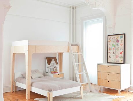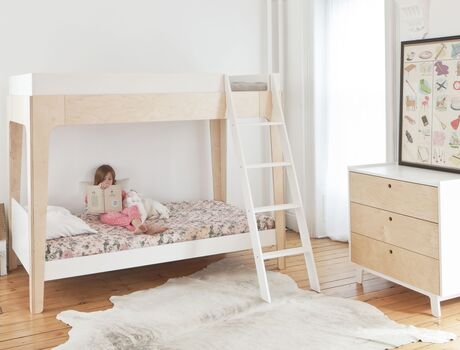 Dieses Stockbett von Oeuf gibt seinem Besitzer die Möglichkeit den unteren Teil des Bettes individuell zu gestalten. Er lässt sich ganz leicht lösen, so dass ein Hochbett und ein Einzelbett daraus werden kann.