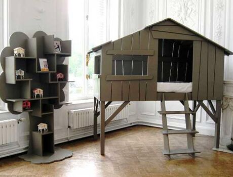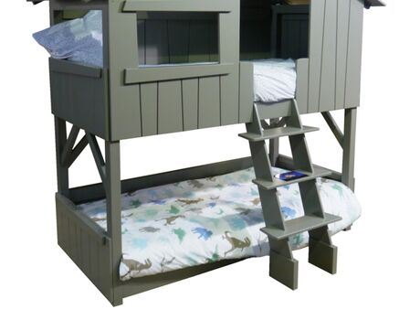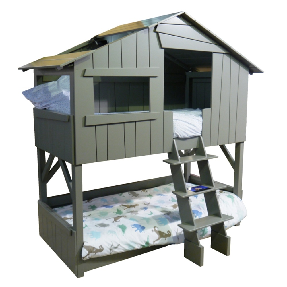 Dieses Modell von Oliver Hayden hat wirklichen Baumhauscharakter. Die Stufen hinauf in den oberen Teil führen in einen richtigen kleinen Unterschlupf mit Fenstern, Dach und Dachluke. Der untere Teil kann individuell genutzt werden. Entweder als Stauraum, Platz für einen kleine Kasten oder ein zweites Bett wird integriert.