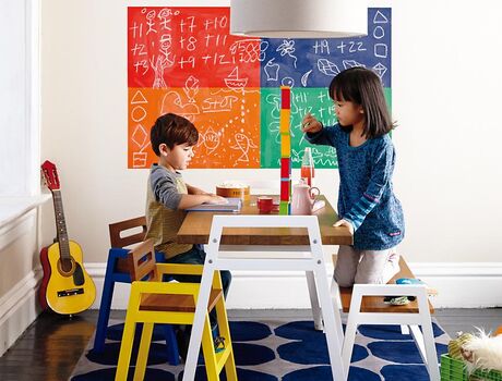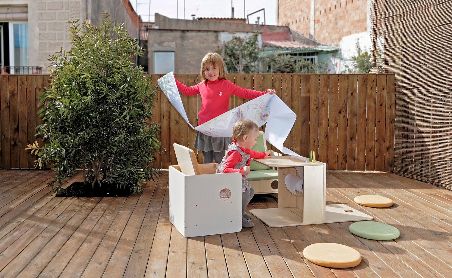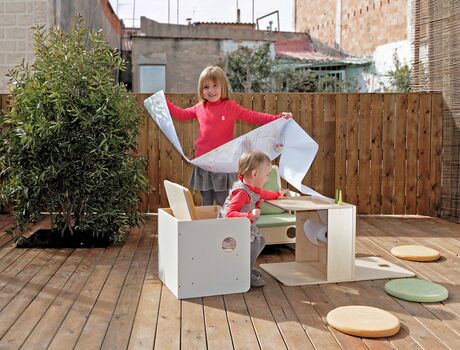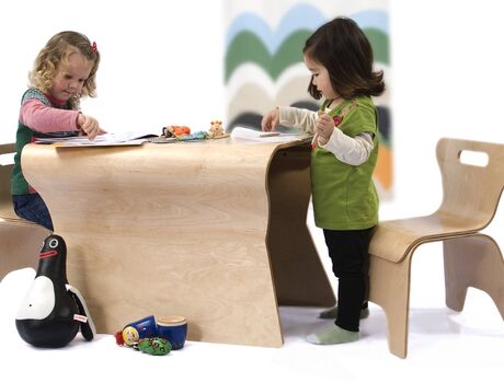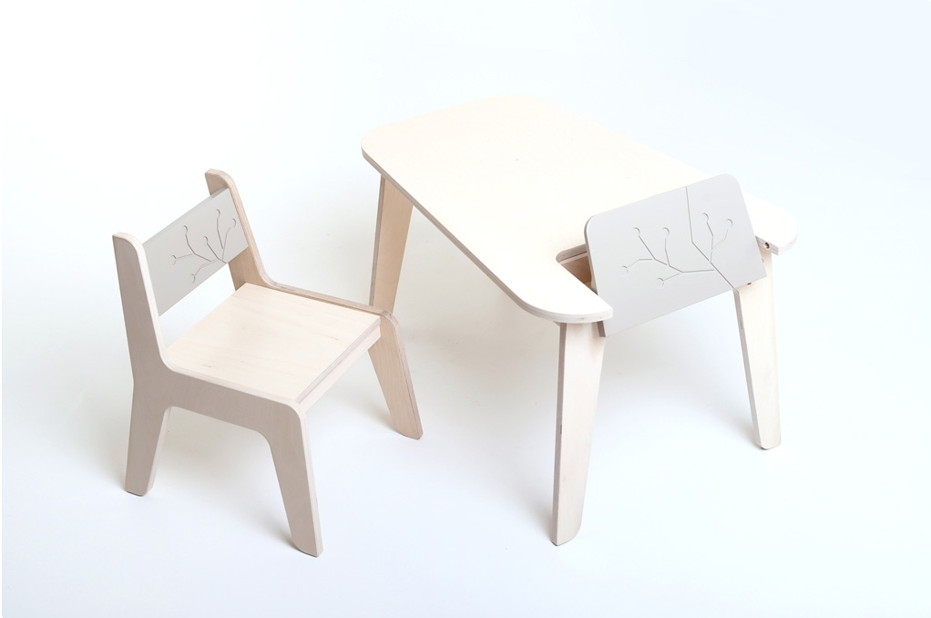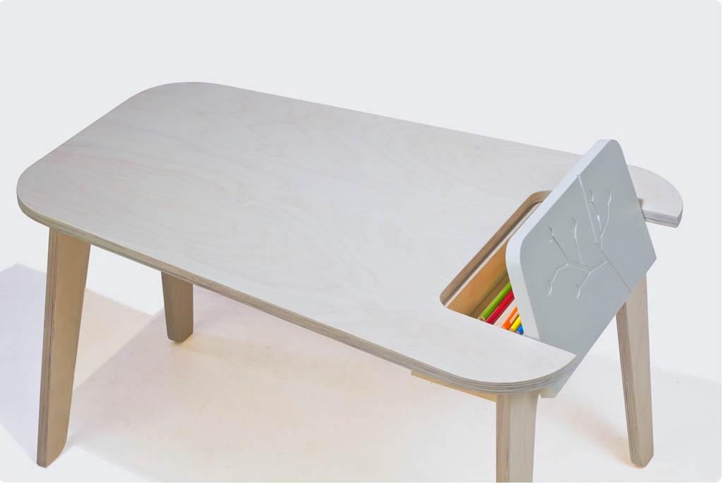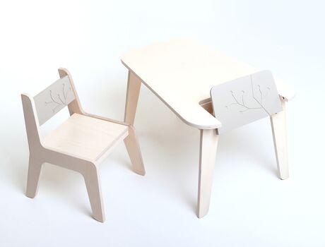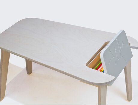 Tisch und Sesseln bird & berry von KUKUU sind platzsparend und kompakt. Gleichzeitig bietet eine Arbeitsfläche hinreichend Platz für zwei Kinder. Das kleine im Tisch integrierte Klappversteck, enthält genug Stauraum für Stifte, Wasserfarben oder Papier.