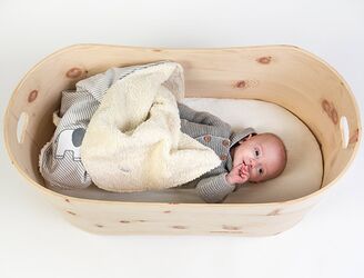 Wenn es mit dem Schlafen mal nicht auf Anhieb klappen will, dann müssen Eltern etwas tiefer in die Trickkiste greifen. Schaukelnde Bewegungen kennen Babys bereits aus dem Mutterleib, daher schlummern sie besonders gerne in einer Wiege oder im Stubenkorb. Die Schaukelwiege von Woodly wird in der Decke fest verankert oder am Dreibein-Ständer „Happy Feet“ befestigt. Das Baby liegt gemütlich auf einer Baumwollmatratze in einem Nest aus reiner Wolle. Dieses Nest wird von einer stabilen Einfassung aus Birkenholz in Position gehalten. Je nachdem wie sich das Kind bewegt, schaukelt auch die Wiege hin und her, vor und zurück. Die sanften Bewegungsmuster ergeben sich ganz natürlich. Der textile Wiegeneinsatz kann gewaschen und später als Zeitungshalter verwendet werden.