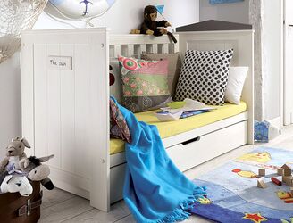 Betten aus Vollholz liefern einen wichtigen Beitrag zum gesunden Schlafklima. Wir haben uns in das Kinderbett „Sunny“ von Allnatura verliebt. Es sieht elegant aus, bringt aber durch sein maritimes Aussehen einen frischen Wind ins Kinderzimmer. Das Modell Sunny besteht aus massivem Kiefernholz, die Oberfläche ist weiß-lasiert und mit grauen Akzenten versehen. Das Bett ist fünffach höhenverstellbar und auch als Juniorbett nutzbar. Wenn der Nachwuchs schon mobil ist, können zwei Gitterlatten entfernt werden. Das Kind kann dann selbstständig aus dem Bett bzw. in das Bett hineinklettern. Später wird Sunny zum Kojenbett beziehungsweise Kindersofa umgebaut. Wickelkommode und Kasten sind ebenfalls im Design „Sunny“ erhältlich.