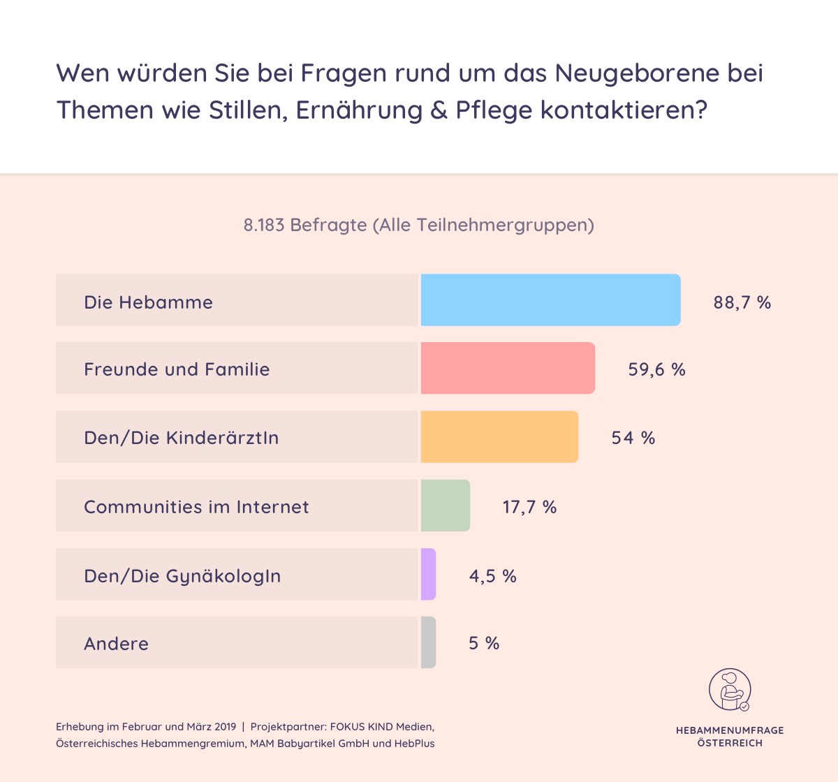 Eine im Februar und März 2019 durchgeführte Studie zum Hebammenberuf zeigt, dass der Großteil aller Eltern eine Hebamme beansprucht und sie eine zentrale Rolle in der Geburtshilfe einnimmt. Initiiert wurde die Umfrage von FOKUS KIND Medien, MAM Babyartikel und HebPlus, unterstützt wurden sie dabei vom mit Österreichischen Hebammengremium. Die Ergebnisse der Online-Umfrage unterstreichen den hohen Bedarf an Hebammen in Österreich, offenbaren aber auch Versorgungslücken.