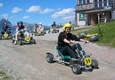 Spaß für die ganze Familie bietet das Mountain-Gokart in Rohrmoos. Und so funktioniert's: Ein Gokartticket beim Ski- oder Sportshop Lenz direkt an der Talstatin der Gipfelbahn Hochwurzen holen. Danach mit der Gondelbahn auf 1900 Meter Seehöhe fahren, wo bereits Go-Karts und Monsterroller bereitstehen. Wer möchte, kann natürlich vor der Abfahrt noch eine Wanderung auf dem Rundweg (ca. 40 Minuten) machen oder einfach den Ausblick genießen. Vor der Abfahrt gibt es noch eine kleine Einschulung und danach geht der Spaß schon los. Auf der sieben Kilometer langen Abfahrt, die ca. 20 bis 30 Minuten dauert, können sich die Familien den Fahrtwind um die Ohren sausen lassen. Auch im Bergrestaurant besteht die Möglichkeit ein Ticket zu kaufen. Jedem Fahrer wird ein Sturzhelm zur Verfügung gestellt. Kinder mit einer Körpergröße unter 150 cm dürfen nur bei einem Erwachsenen mitfahren.