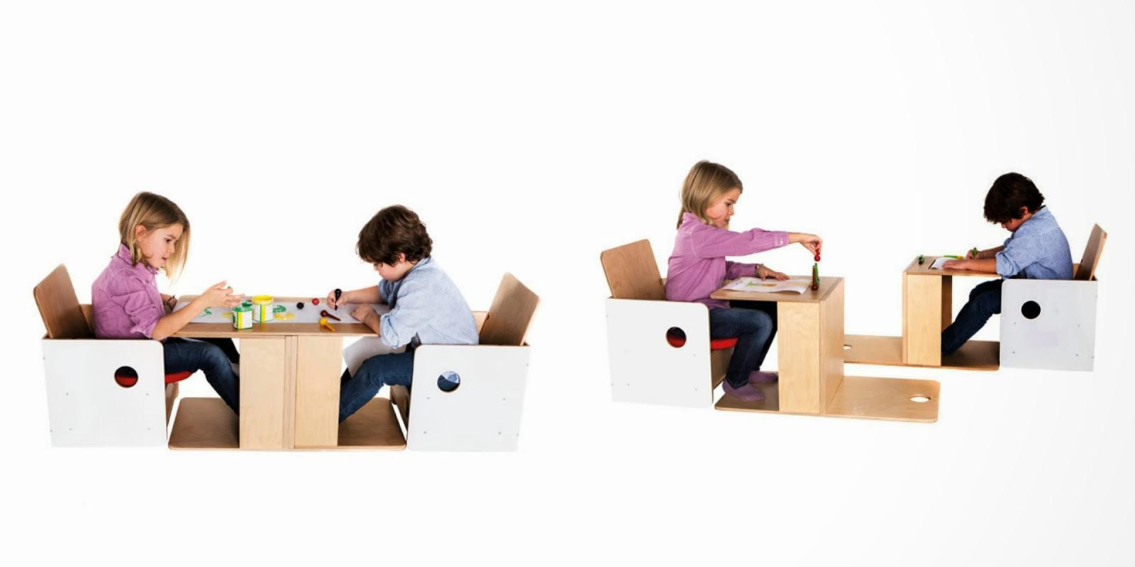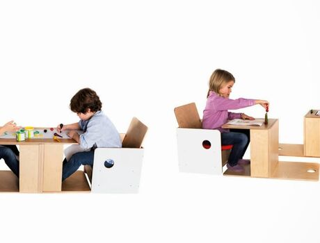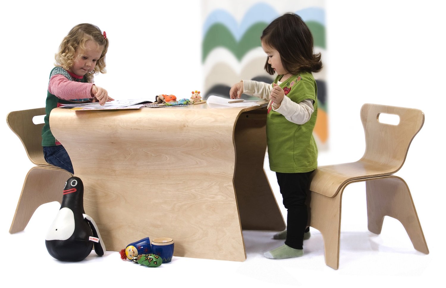 Tisch und Sesseln bird & berry von KUKUU sind platzsparend und kompakt. Gleichzeitig bietet eine Arbeitsfläche hinreichend Platz für zwei Kinder. Das kleine im Tisch integrierte Klappversteck, enthält genug Stauraum für Stifte, Wasserfarben oder Papier.