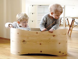 Wenn es mit dem Schlafen mal nicht auf Anhieb klappen will, dann müssen Eltern etwas tiefer in die Trickkiste greifen. Schaukelnde Bewegungen kennen Babys bereits aus dem Mutterleib, daher schlummern sie besonders gerne in einer Wiege oder im Stubenkorb. Die Schaukelwiege von Woodly wird in der Decke fest verankert oder am Dreibein-Ständer „Happy Feet“ befestigt. Das Baby liegt gemütlich auf einer Baumwollmatratze in einem Nest aus reiner Wolle. Dieses Nest wird von einer stabilen Einfassung aus Birkenholz in Position gehalten. Je nachdem wie sich das Kind bewegt, schaukelt auch die Wiege hin und her, vor und zurück. Die sanften Bewegungsmuster ergeben sich ganz natürlich. Der textile Wiegeneinsatz kann gewaschen und später als Zeitungshalter verwendet werden.
