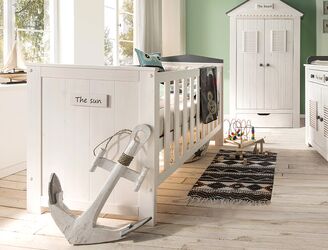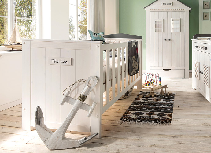 Betten aus Vollholz liefern einen wichtigen Beitrag zum gesunden Schlafklima. Wir haben uns in das Kinderbett „Sunny“ von Allnatura verliebt. Es sieht elegant aus, bringt aber durch sein maritimes Aussehen einen frischen Wind ins Kinderzimmer. Das Modell Sunny besteht aus massivem Kiefernholz, die Oberfläche ist weiß-lasiert und mit grauen Akzenten versehen. Das Bett ist fünffach höhenverstellbar und auch als Juniorbett nutzbar. Wenn der Nachwuchs schon mobil ist, können zwei Gitterlatten entfernt werden. Das Kind kann dann selbstständig aus dem Bett bzw. in das Bett hineinklettern. Später wird Sunny zum Kojenbett beziehungsweise Kindersofa umgebaut. Wickelkommode und Kasten sind ebenfalls im Design „Sunny“ erhältlich.