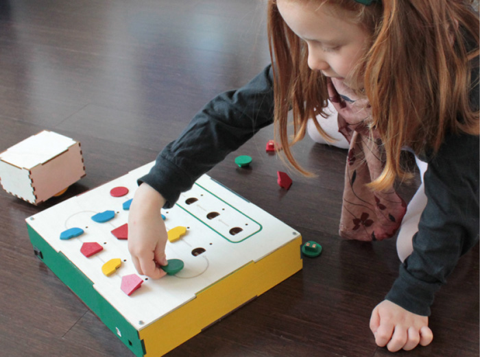 Primo hat sich dafür eine ganz einfache Idee ausgedacht. Sie setzen auf den kleinen fahrendem Roboter Cubetto, der über ein physisches Interface programmiert wird. Bei diesem Interface handelt es sich um ein Holz Board, in das die Kleinen vier verschiedene Bausteine stecken können. Die Steine kommen in Form von Pfeilen und symbolisieren – „vorwärts“, „rechts“, „links“ und „Funktion.