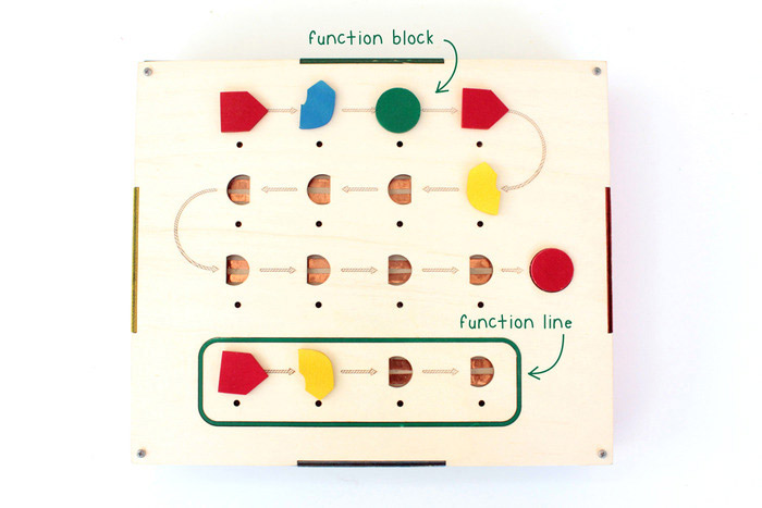 Die Funktionen „vorwärts“, „rechts“, „links“ bewegen den fahrenden Roboter Cubetto dementsprechend, während das Funktionssymbol eine eigene Unterfunktion auslöst. Was in dieser Unterfunktion passieren soll, kann in einem gesonderten Bereich am Holzboard eigens gesteckt werden. Den Kleinen werden somit die verschiedenen Strukturierungen eines Softwaredesigns näher gebracht.