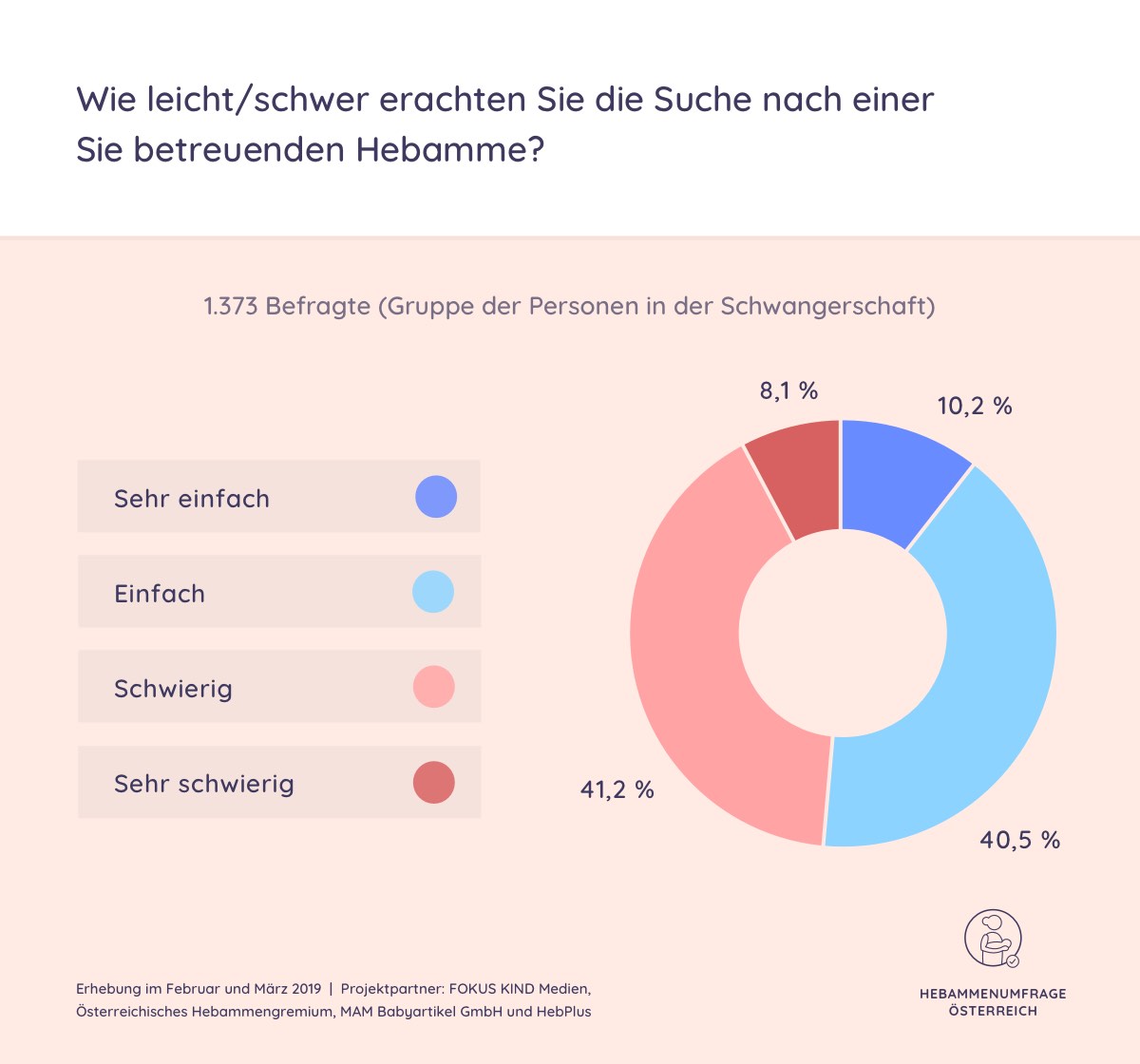 Eine im Februar und März 2019 durchgeführte Studie zum Hebammenberuf zeigt, dass der Großteil aller Eltern eine Hebamme beansprucht und sie eine zentrale Rolle in der Geburtshilfe einnimmt. Initiiert wurde die Umfrage von FOKUS KIND Medien, MAM Babyartikel und HebPlus, unterstützt wurden sie dabei vom mit Österreichischen Hebammengremium. Die Ergebnisse der Online-Umfrage unterstreichen den hohen Bedarf an Hebammen in Österreich, offenbaren aber auch Versorgungslücken.